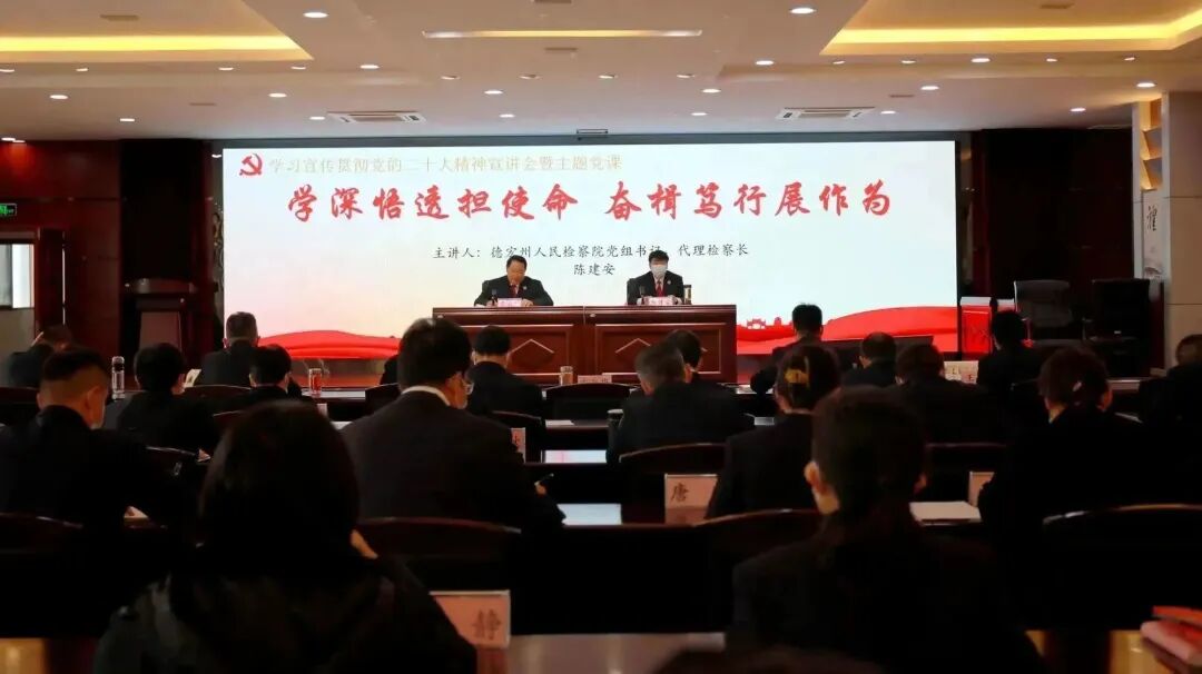 一是学习宣传贯彻党的二十大精神,重在学深悟透、知行合一。陈建安代理检察长充分阐释了党的二十大和习近平总书记代表十九届中央委员会所作的报告重大意义;从全省、全州和德宏检察工作三个层面系统总结回顾了过去10年的发展伟绩。他强调,这些成绩的取得,根本在于以习近平同志为核心的党中央坚强领导,在于习近平新时代中国特色社会主义思想科学指引。他指出,检察人员既是见证者,也是亲历者,更是参与者。他要求,全州检察机关、检察人员要把学习宣传贯彻好党的二十大精神作为是当前和今后一个时期的首要政治任务,按照习近平总书记提出“五个牢牢把握”和“三个下功夫”;按照中央《决定》明确的“九个深刻领会”和“七个聚焦”,坚持原原本本学、全面系统学、带着感情学、联系实际学,逐字逐句学,深入理解内涵,精准把握外延,切实以党的二十大精神统一思想、武装头脑、推动工作。
