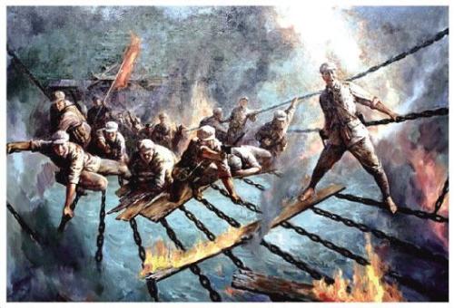 “金沙浪拍云崖暖,大渡桥横铁索寒。”一联是写水,也是写红军对水的征服。红军渡过金沙江和大渡河在长征史上有着重要的意义。金沙江宽阔而湍急,蒋介石梦想利用这一天险围歼红军于川、滇、黔边境。1935年5月红军巧渡金沙江。如果说巧渡金沙江是红军战略战术最富有智慧、最成功的一次战斗,那么强渡大渡河则是红军表现最勇敢、最顽强的一次战斗。大渡河的险恶也不亚于金沙江,且有敌人的重兵把守,狡猾的敌人还拆掉河上泸定桥的木板,只留下十三根铁索。但是英勇的红军硬是冒着国军的枪林弹雨闯过了大渡河,粉碎了蒋介石企图使红军成为第二个石达开的阴谋。所以这两句所写的战斗都是具有典型意义的。“五岭”“乌蒙”两句通过红军的主观感受直接表现了红军的英雄气概,这两句则是通过写景来记事,通过记事来表现红军的英雄事迹。