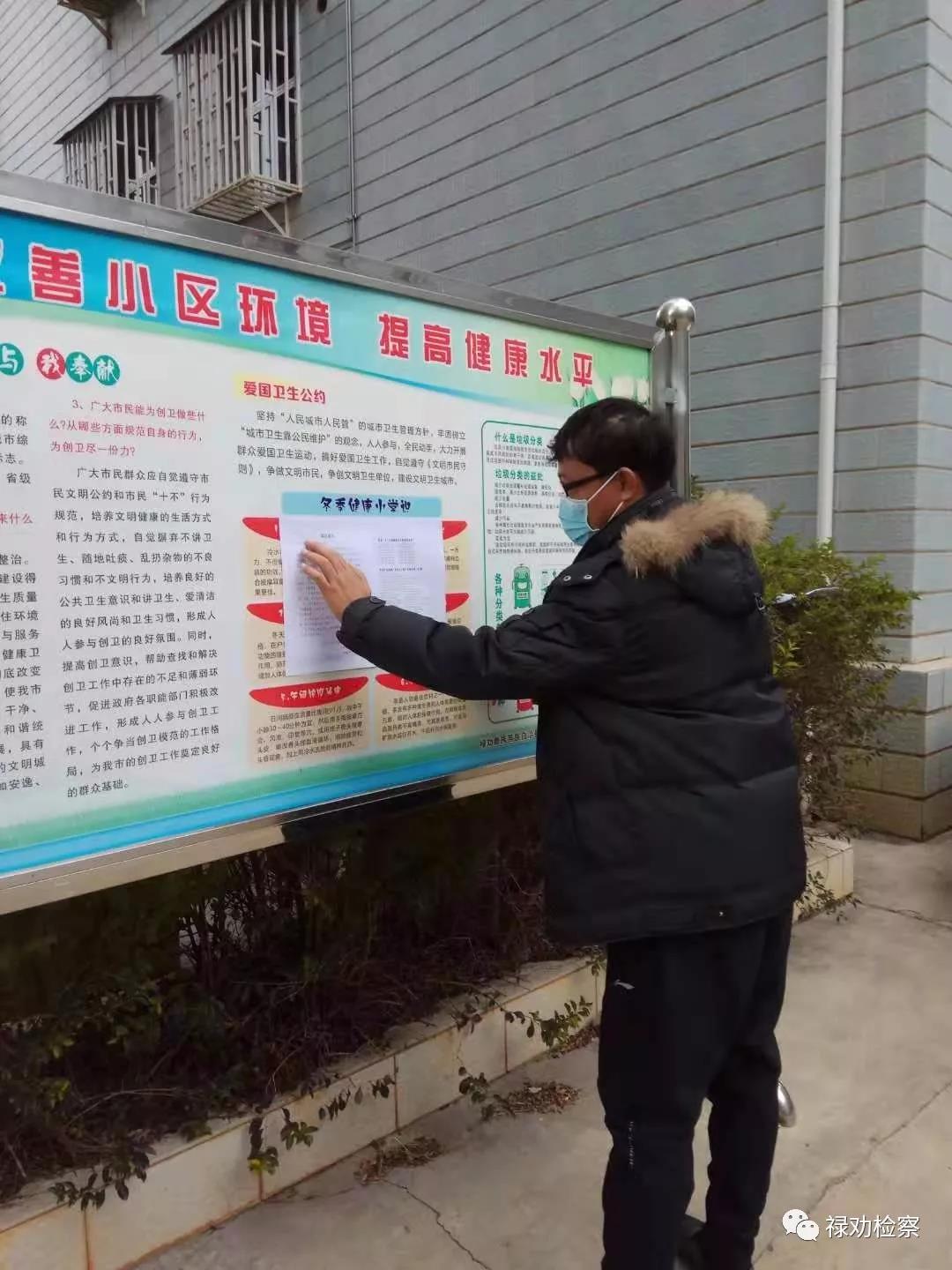 副检察长杨志文同志和党组成员、纪检组长张元虹同志带领党员干警对家属区及老旧小区住户摸排,对住户过年期间出行、聚会、家中是否接触武汉籍人员等情况进行排查。向住户宣传预防知识,在小区公告栏、大门显着位置张贴疫情宣传单。