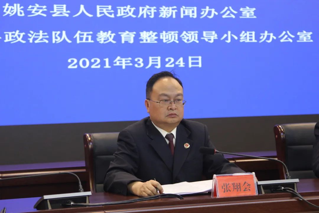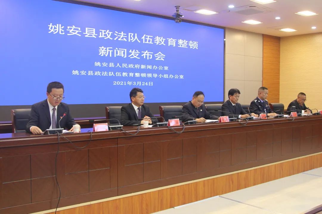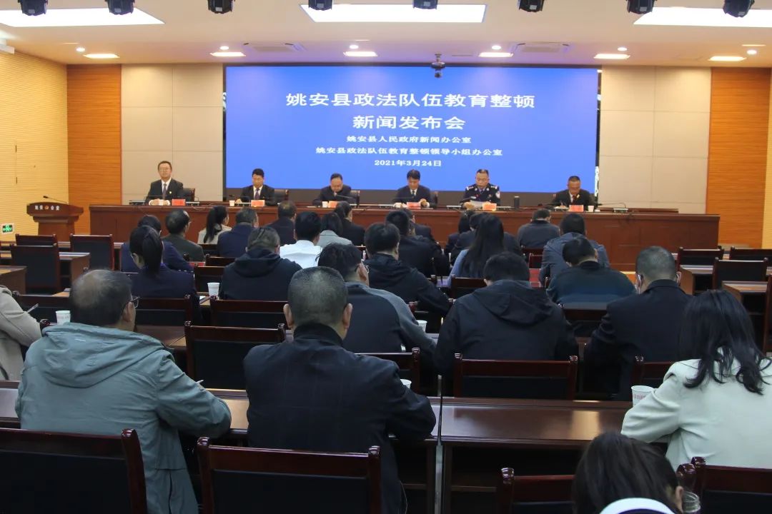 2021年3月24日下午,姚安县政法队伍教育整顿第一次新闻发布会在姚安县公安局召开,县委宣传部、县人民政府新闻办、县人民法院、县人民检察院、县公安局、县司法局联合发布政法队伍教育整顿工作情况。部分党代表、人大代表、政协委员、律师代表、人民监督员代表、特约监察员代表和部分电视台、网络媒体记者参加了当天的新闻发布会。