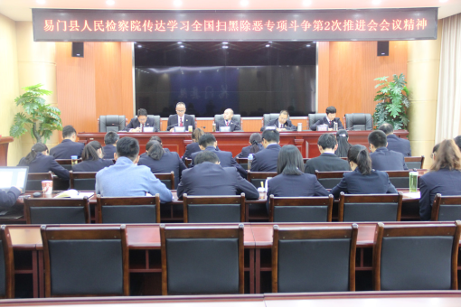 2019年10月15日下午,易门县院召开全院干警大会,专题安排部署下一阶段扫黑除恶专项斗争工作。杨建明副检察长在会议上传达学习了全国扫黑除恶专项斗争第 2 次推进会会议精神和省院贯彻意见、市院方家明副检察长在全市扫黑除恶专项斗争工作推进会上的讲话精神,对我院主题教育中开展对黄赌毒和黑恶势力听之任之、失职失责甚至包庇、纵容充当“保护伞”的专项整治工作进行了安排部署,并对做好下一阶段工作提出了三点意见: